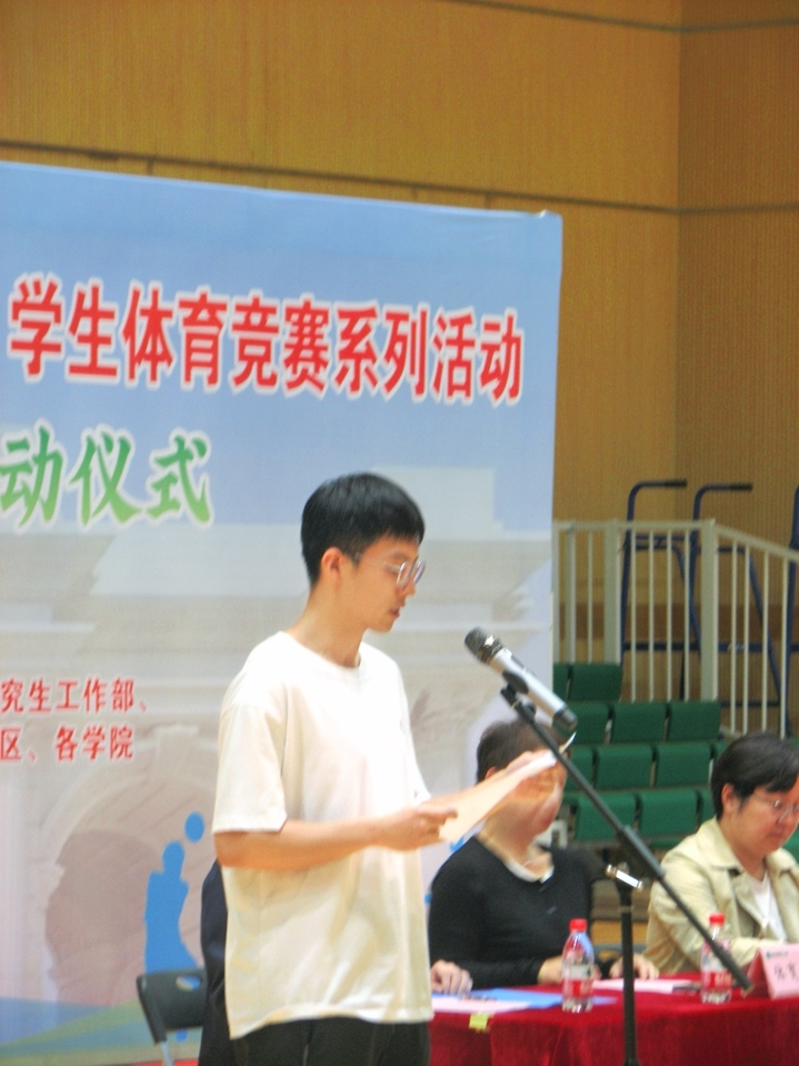 国际教育学院21级的学生韩传志作为参赛运动员代表发言,将以积极热情的态度参加本届羽毛球比赛 ,严格遵守比赛规则,坚决服从裁判,尊重对手;发扬团结协作,顽强拼搏的精神;赛出风格,赛出水平,赛出最好成绩。