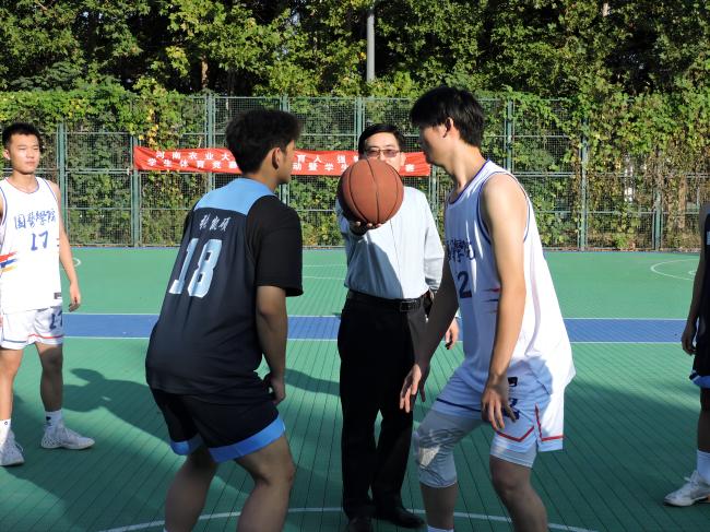 “以体育人 强智健体”系列活动首届篮球比赛开幕,并主持跳球。各学院按照预定的比赛规程展开了2023年学生篮球比赛。
