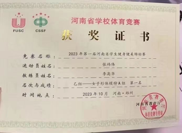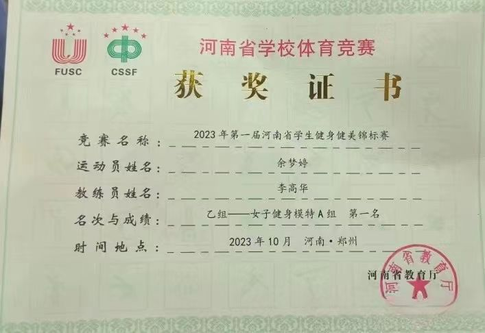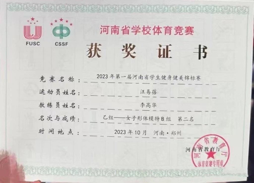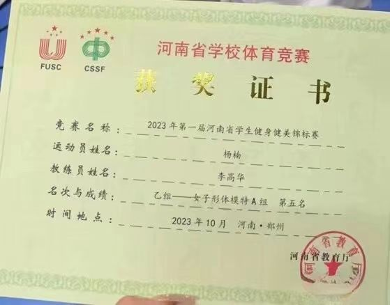 5名队员共参加了本科乙组的比赛。在比赛中,队员们不畏强手,顽强拼搏,克服脱水和饮食上的困难,充分发挥出最佳竞技水平。取得了乙组女子形体模特A组冠军,乙组女子健身模特A组冠军,女子形体模特B组亚军,乙组女子形体模特A组第五名,乙组团体一等奖,乙组优秀组织奖等优异成绩。