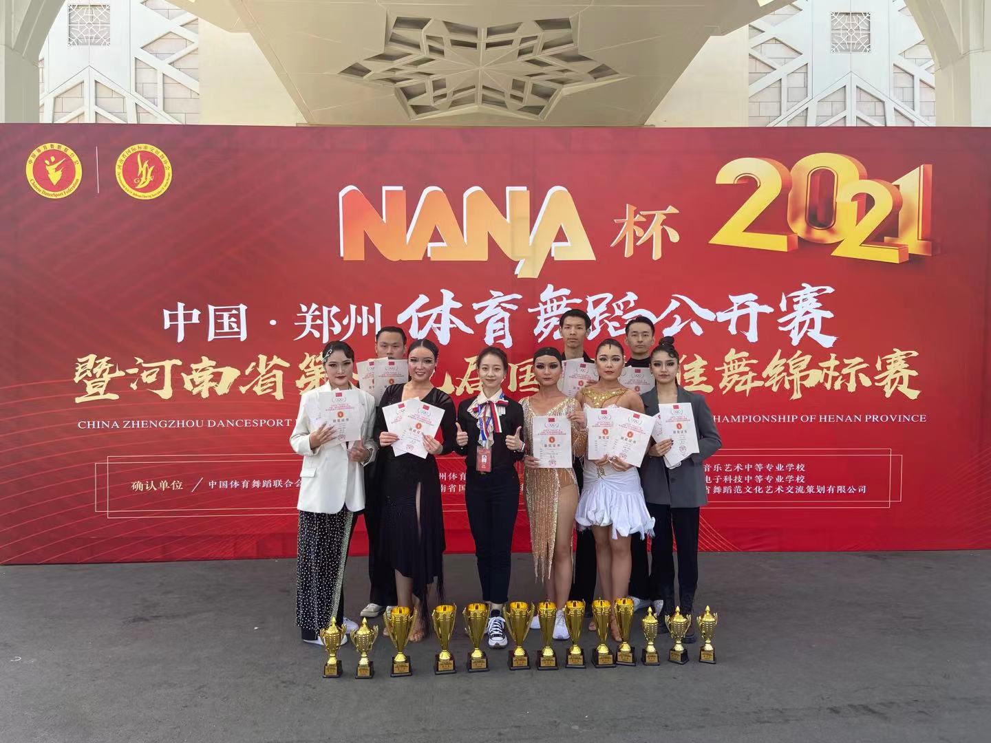 在另一个赛场上,国标舞课程组孙雪帆老师率队参加河南省国际标准舞锦标赛也获得2项冠军、2项亚军、2项季军的不俗表现。