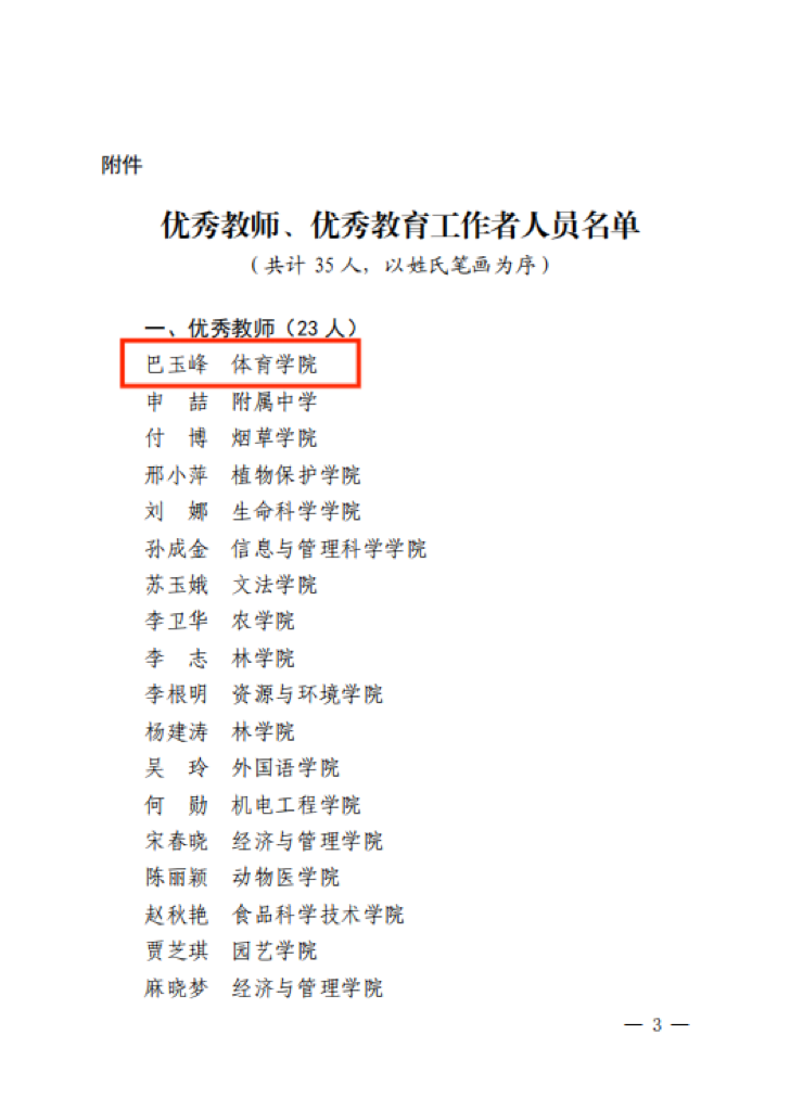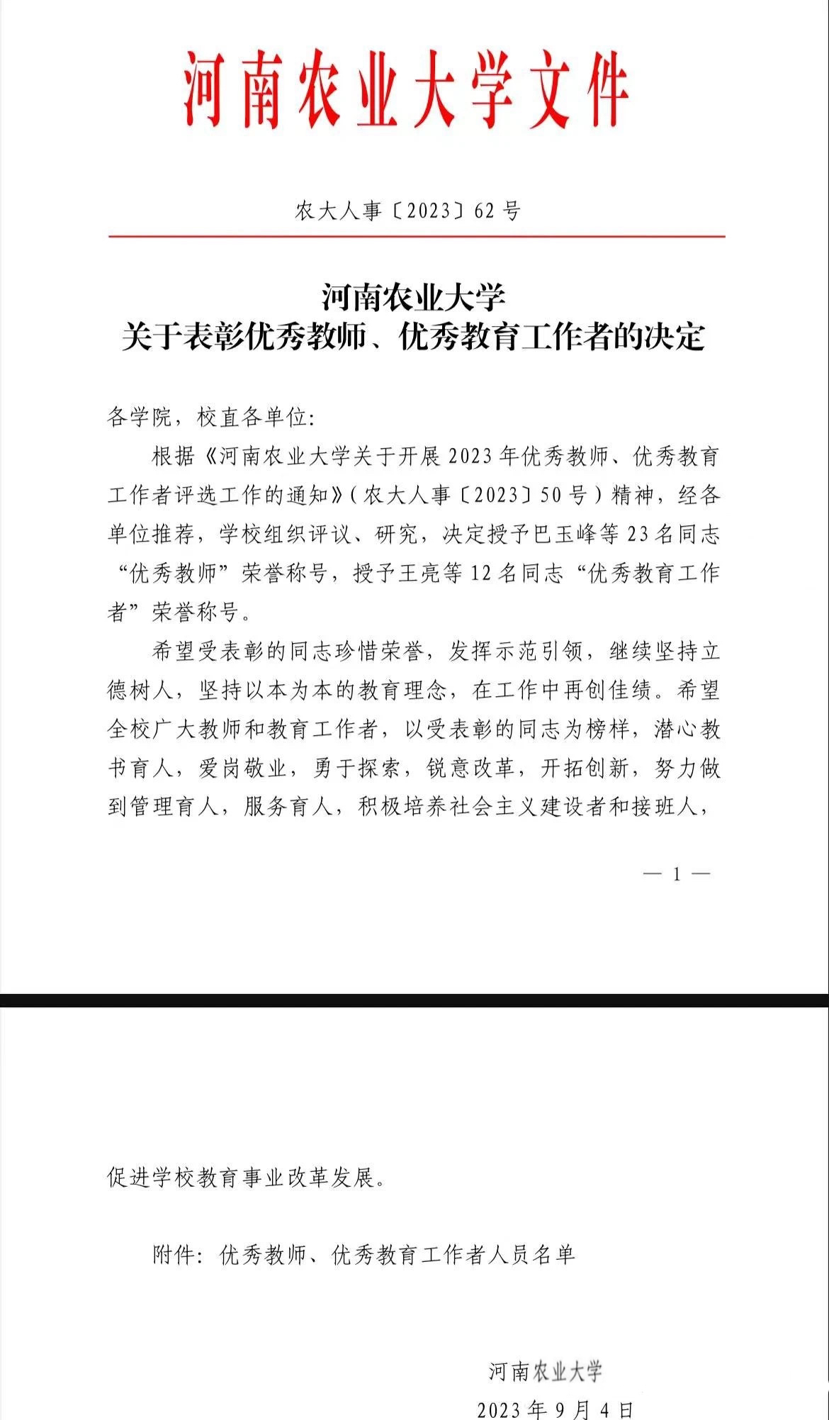 根据《亚洲无码 关于表彰优秀教师、优秀教育工作者的决定》(农大人事【2023】62号),亚洲无码 巴玉峰老师荣获亚洲无码 2023年“优秀教师”荣誉称号。