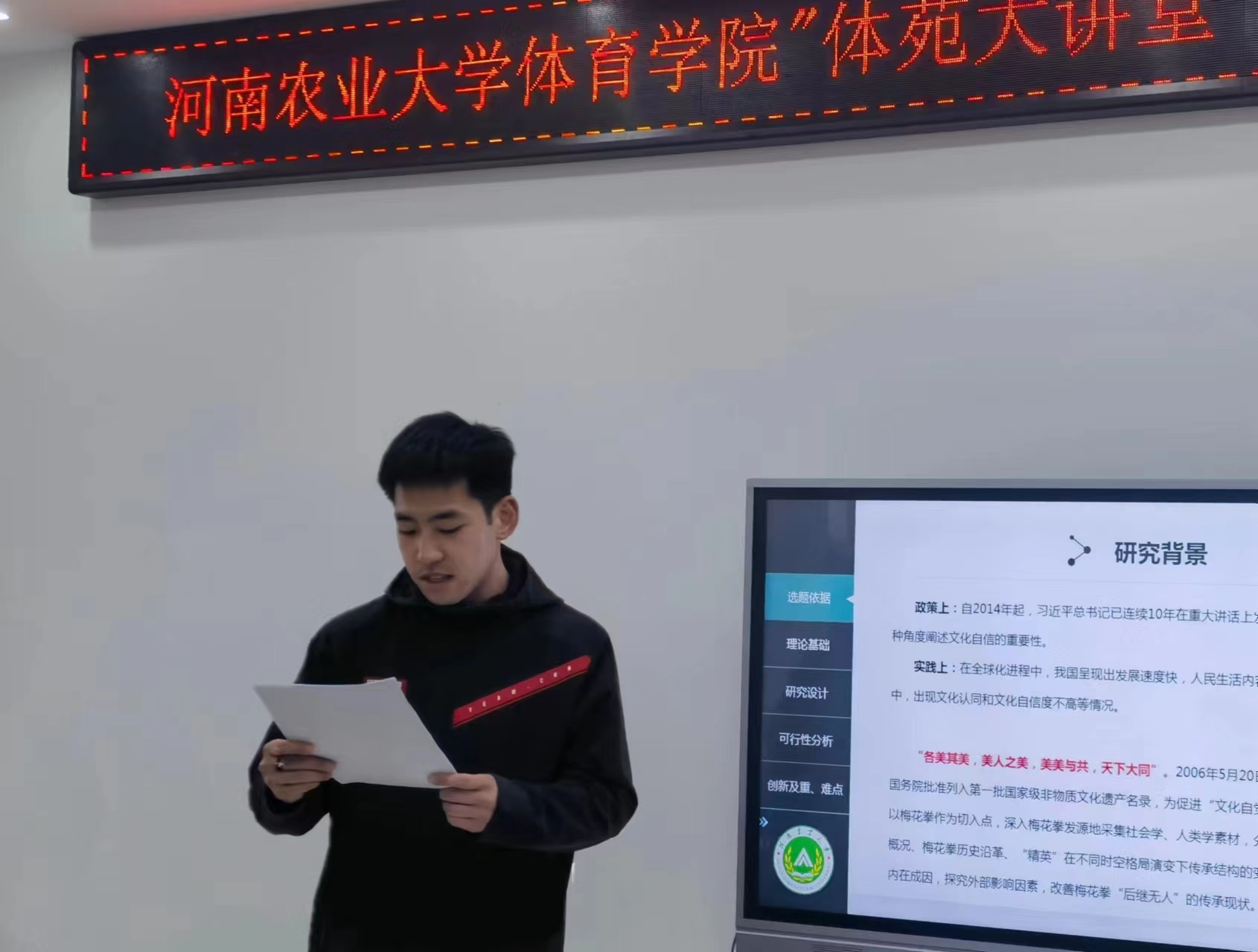 牛浩凯老师分别从选题依据、理论基础、研究设计、可行性分析、创新及重难点这五个方面进行了论述,梅花拳作为国家级非物质文化遗产,其历史沿革、发展及传承的研究都具有重要意义。